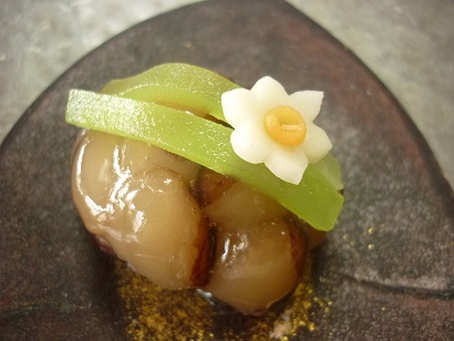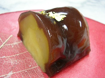 黄身餡に栗の甘露煮を合わせ、羊羹をかけました。